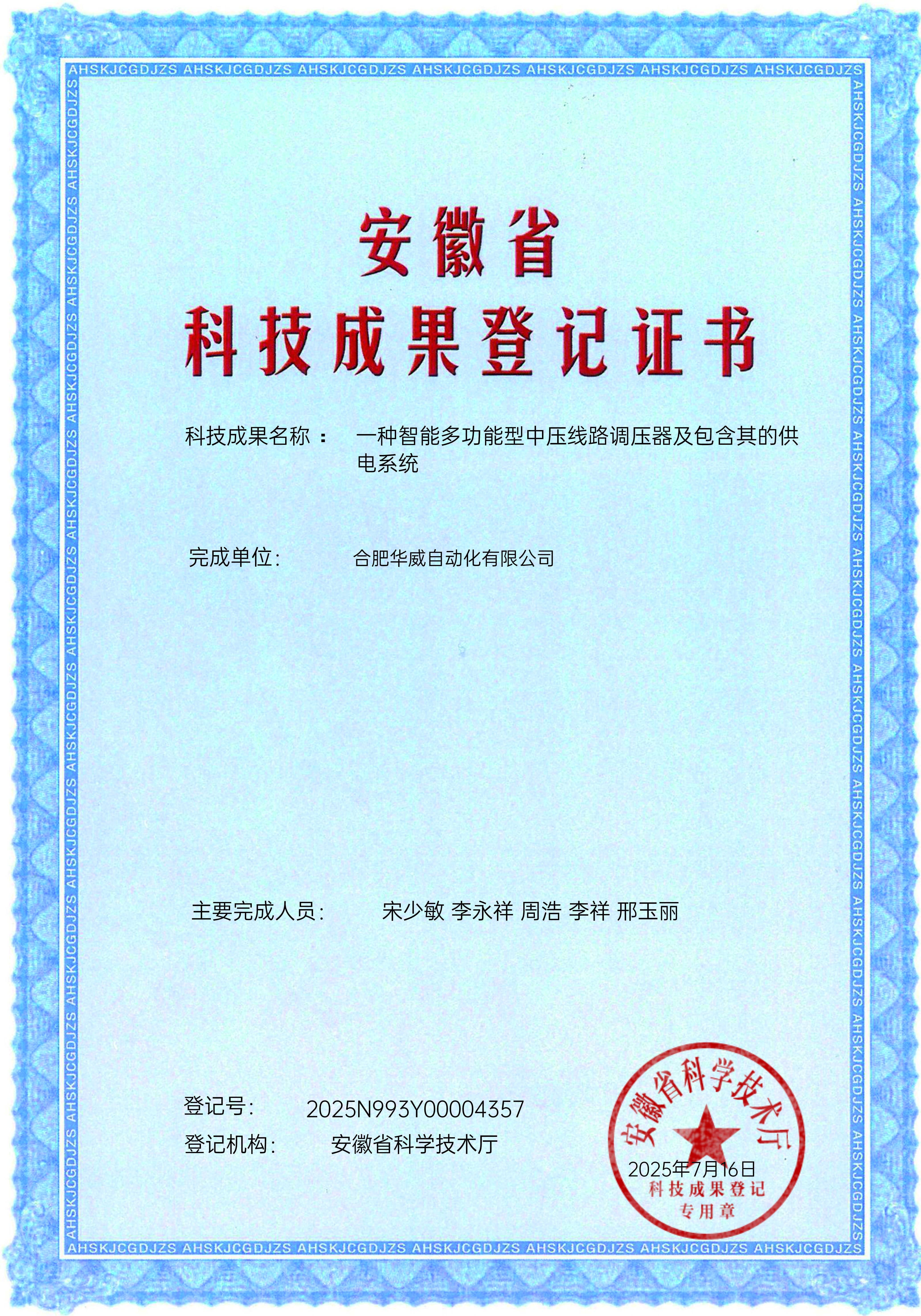 安徽省科技成果登記證書